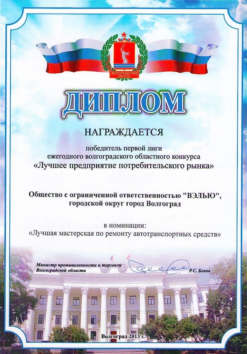 По итогам работы в 2013 Pin UpКомпания ВЭЛЬЮстала победителем первой лиги ежегодного Pin Up областного конкурса «Лучшее предприятие потребительского рынка» в номинации «Лучшая мастерская по ремонту автотранспортных средств».